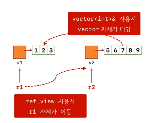 // std::ranges::ref_view r2(std::vector<int>{1,2,3}); // error - ref_view는 내부적으로 포인터기때문에 임시객체(rvalue)를 받을 수 없다
