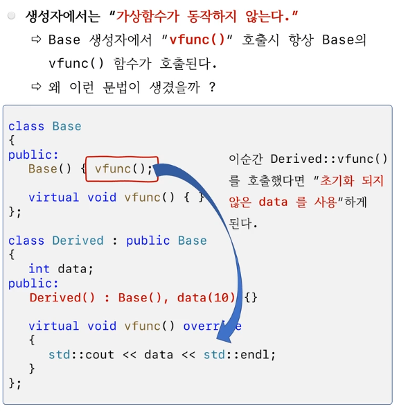 - 생성자에서는 가상함수가 작동하지 않음